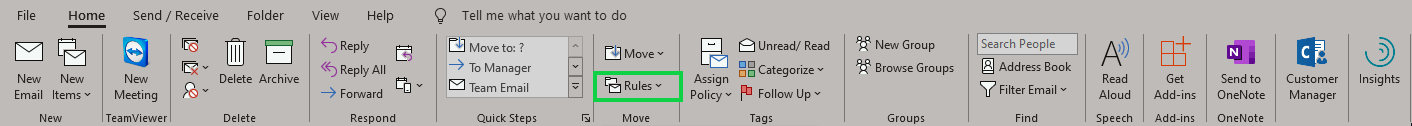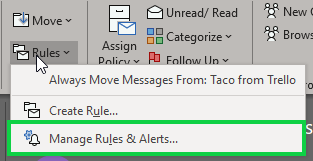 Step 1: Click on the "Rules" drop-down on the top of the Outlook window in a section named "Move"