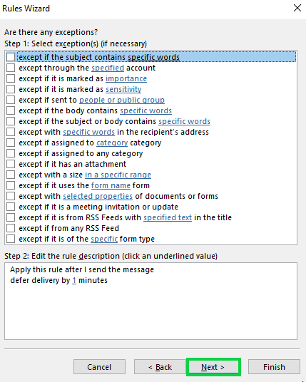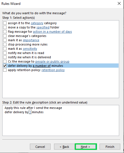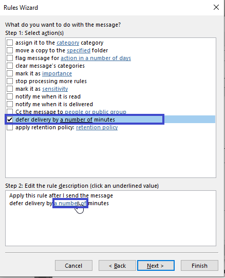 Step 7: Select "defer delivery by a number of minutes", then click "a number of" in the window below